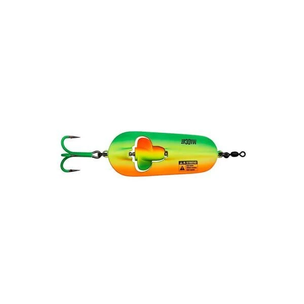 Een product van Madcat een ratelende blinker, beweegt als een blinker maar heeft een roterend lijf met kogeltjes die geluid produceren. A-Static Dreggen maat 3/0 die gecoat zijn met rubber zodat het elektrische veld zo klein mogelijk is. Door het gebruik kan de coating slijten.
