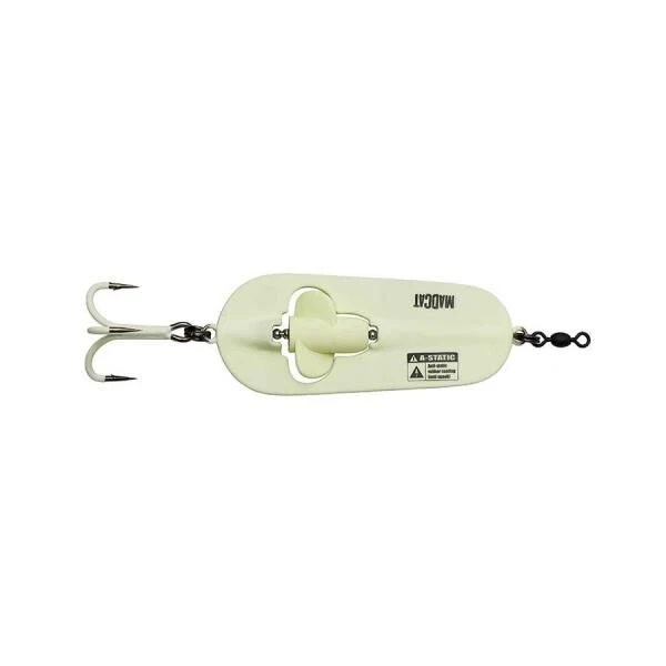 Een product van Madcat een ratelende blinker, beweegt als een blinker maar heeft een roterend lijf met kogeltjes die geluid produceren. A-Static Dreggen maat 3/0 die gecoat zijn met rubber zodat het elektrische veld zo klein mogelijk is. Door het gebruik kan de coating slijten.